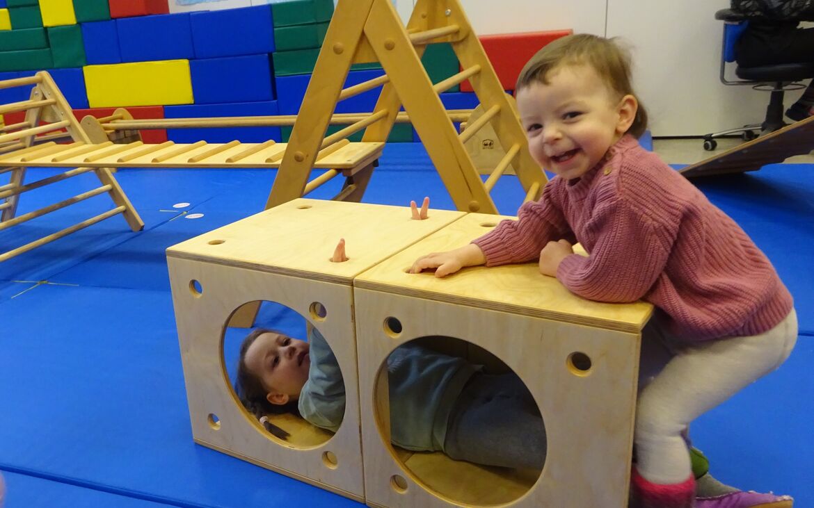 Bewegungsraum für Einjährige mit Piklerwürfeln, Tunneln, Piklerdreieck, Rutschbrettern...