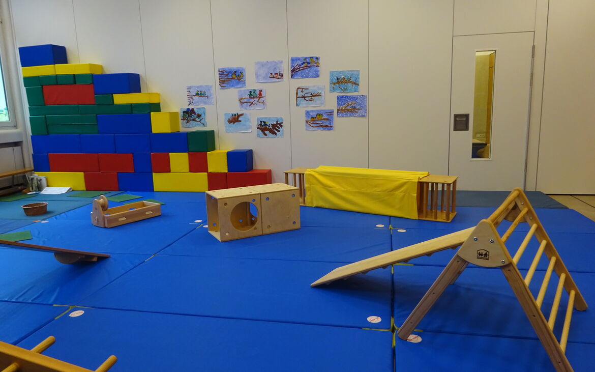 Der Bewegungsraum ist mit Turnmatten und Bewegungsmaterialien nach Emmi Pikler vorbereitet, die dem Entwicklungsstand des Kindes entsprechen.