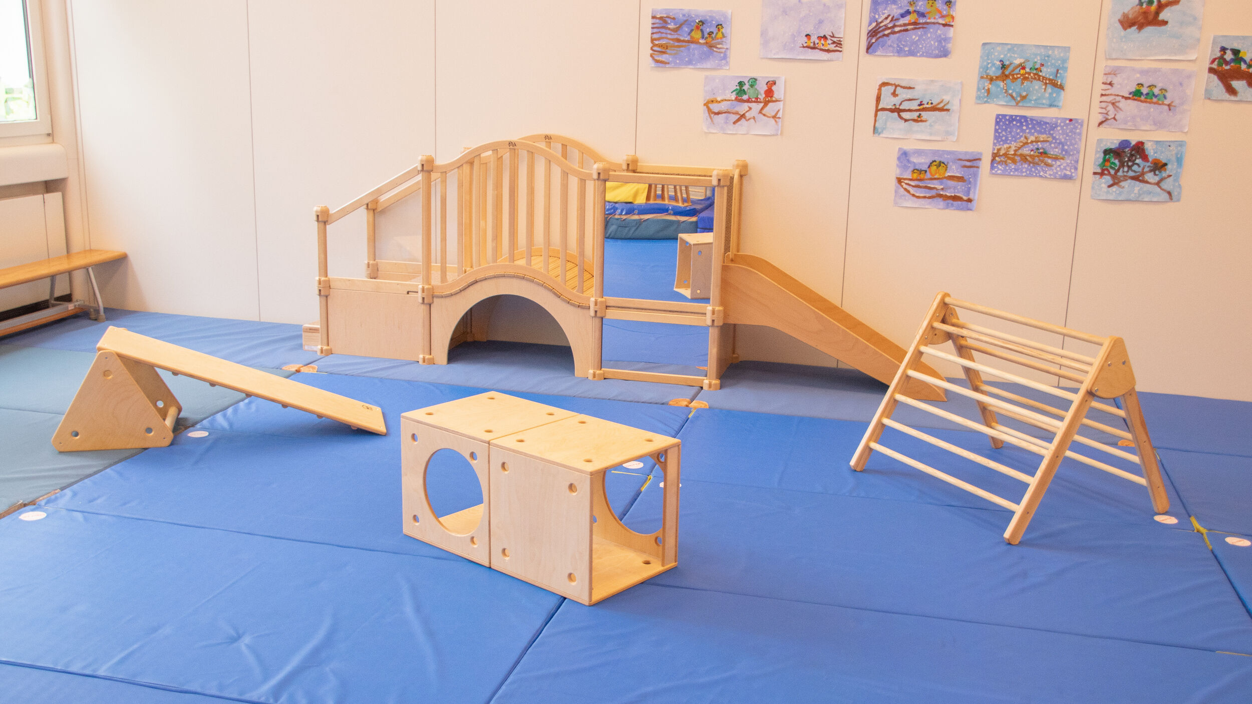 Die Kinder werden motiviert durch eine altersentsprechende Bewegungslandschaft mit Piklerdreieck, Piklerwürfeln, Piklertunnel, Rutschbrettern und mehr.