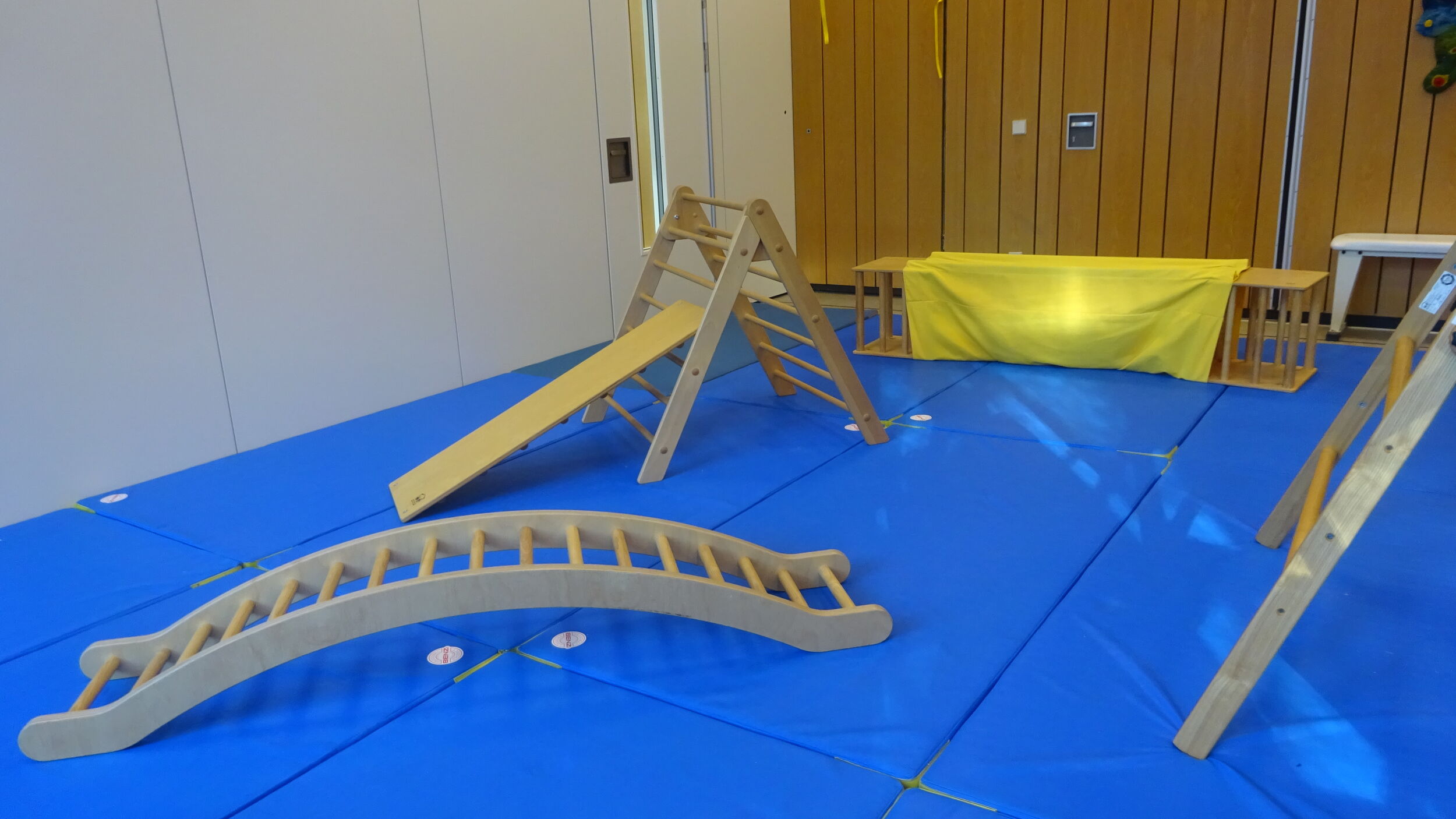 Der Bewegungsraum ist mit Turnmatten und Bewegungsmaterialien nach Emmi Pikler und Elfriede Hengstenberg vorbereitet, die dem Entwicklungsstand des Kindes entsprechen.